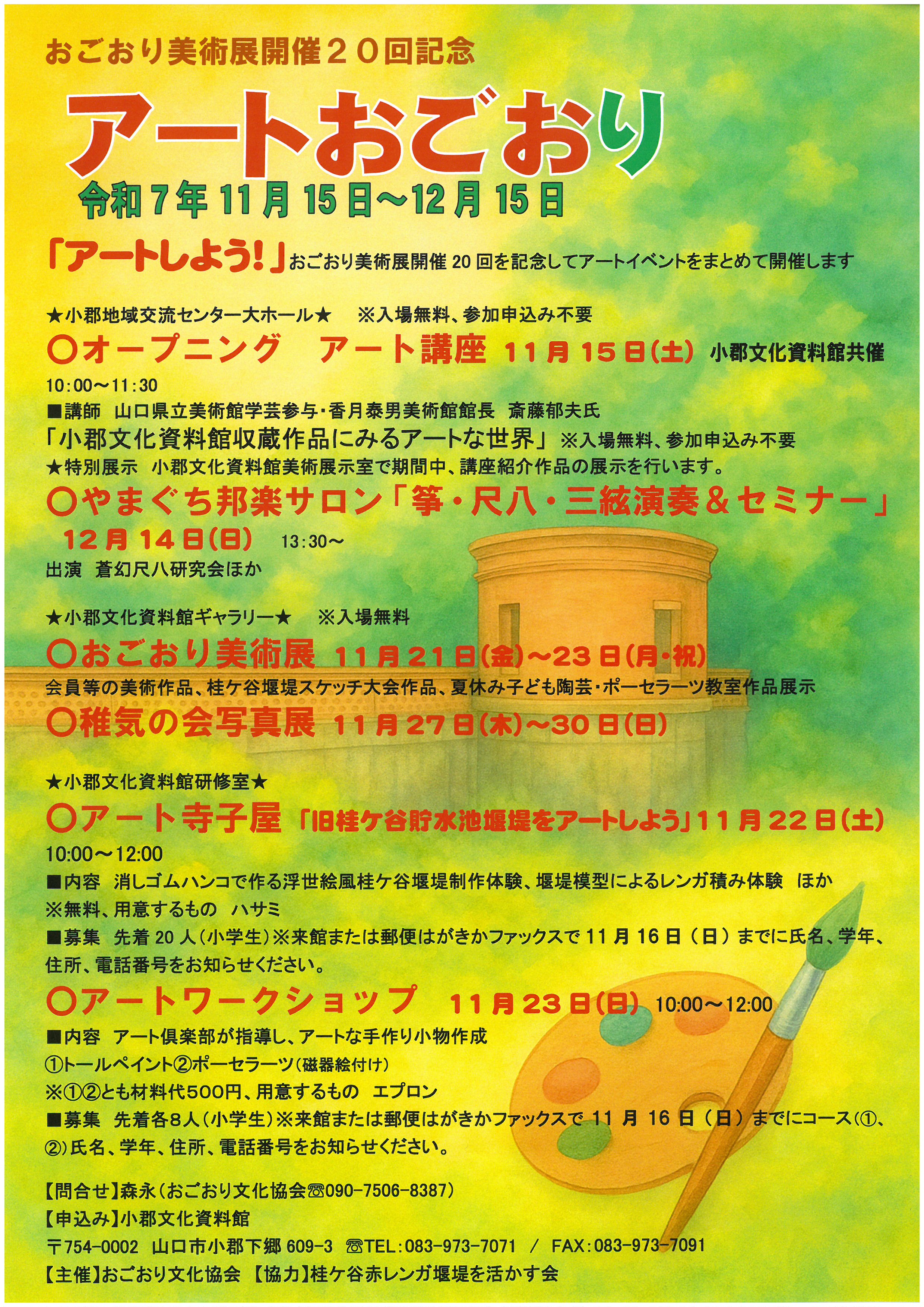 オープニング アート講座「小郡文化資料館収蔵作品にみるアートな世界」(11月15日開催)に関連し、講座内で紹介された館蔵作品の作家と、小郡ゆかりの作家の美術作品を展示します。 講座と併せてご鑑賞ください。 【展示期間】令和7年11月15日(土) ~ 令和8年2月1日(日) 【展示場所】2階「ふるさとゆかりの美術」展示室